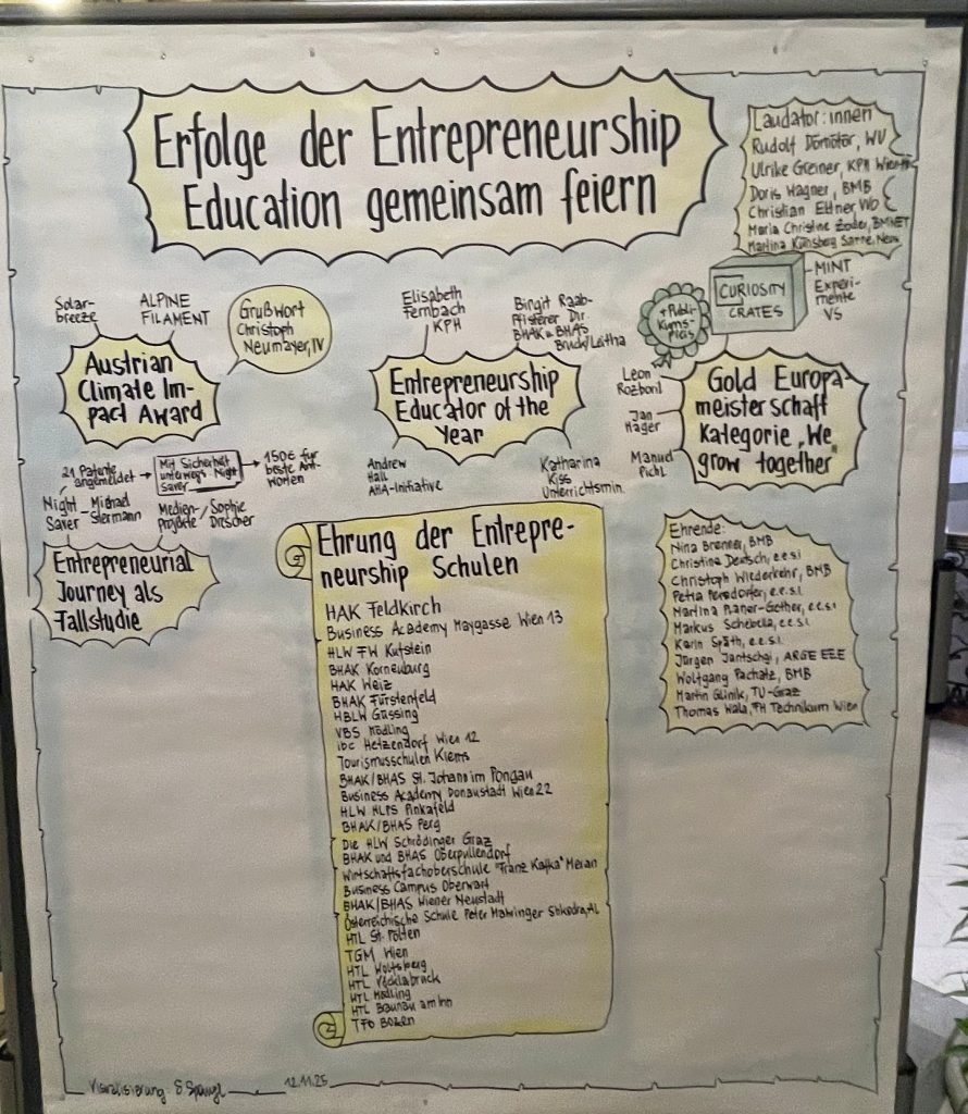 „Bildung befindet sich im Wandel – Entrepreneurship Education vermag es, zentrale Kompetenzen wie kritisches Denken und Innovationsfähigkeit bei Schüler:innen gezielt zu fördern“, betonte Bildungsminister Christoph Wiederkehr im Rahmen der feierlichen Urkundenverleihung, bei der er gemeinsam mit zahlreichen namhaften Redner:innen die engagierte Arbeit an den zertifizierten Schulen würdigte.